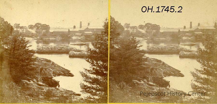 A stereo view photo of the Androscoggin River looking downstream from the Topsham, Maine side. Not dated.