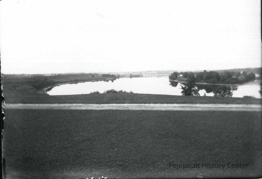 A B/W photograph of the Androscoggin River from Casino at Merrymeeting Park, 8-25-1903, print from glass plate negative.