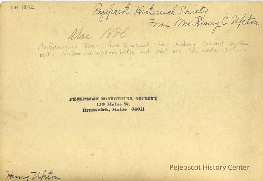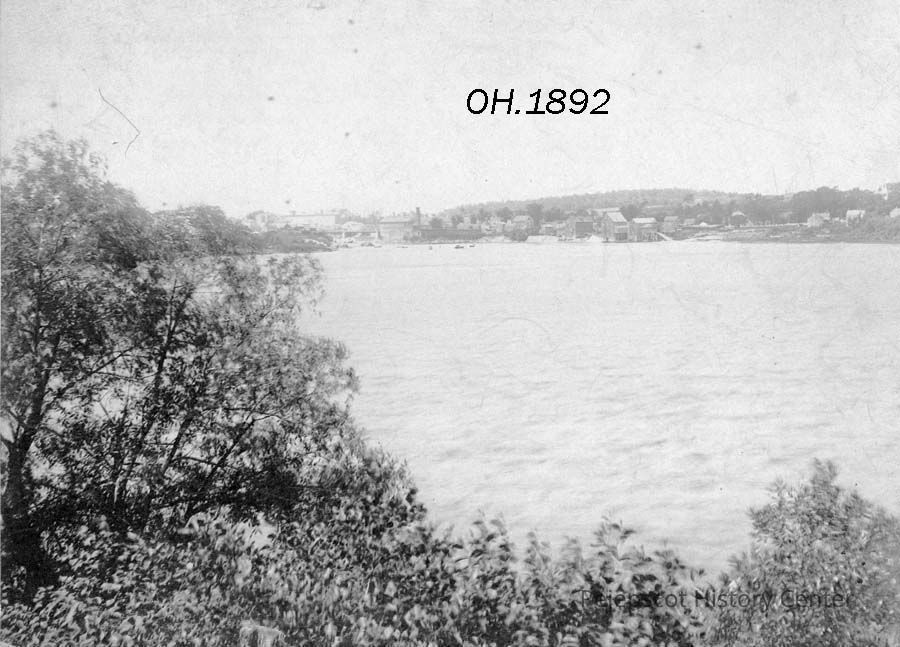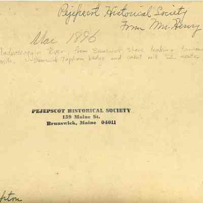 A B/W photograph of the Androscoggin River taken from the Brunswick, ME side looking towards Topsham. 1897.