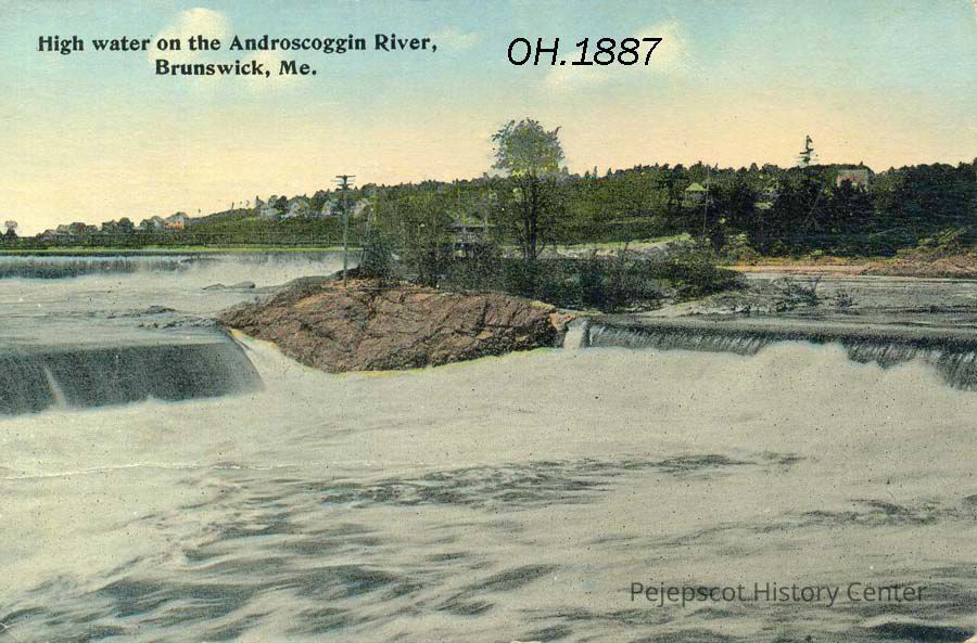 A picture postcard view of high water on the Androscoggin River, Brunswick, Maine. Not dated.