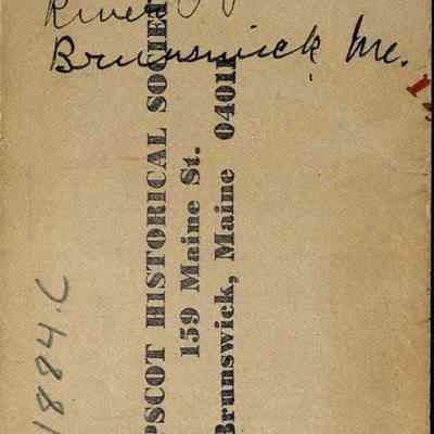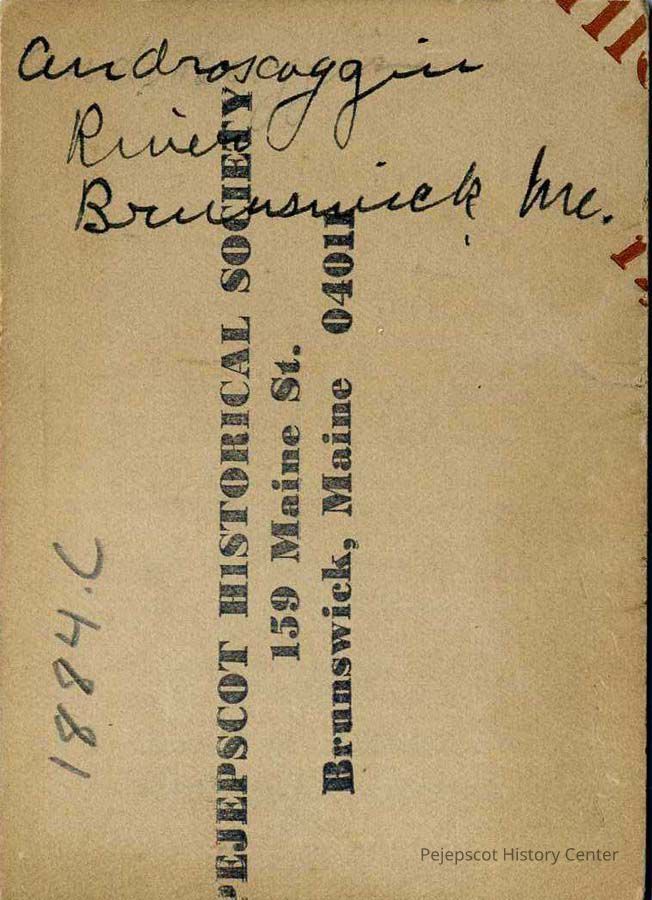 A B/W photograph of the Androscoggin River looking downstream from above the foot bridge. Brunswick, ME. Not dated.