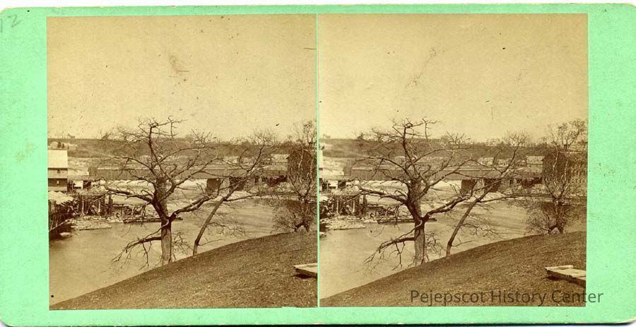 Stereopticon slides, Stereographs, Photographers - Wm. Pierce, Androscoggin River, Streets - Water, Bowdoin Mill, Bridges - Androscoggin Bridge, Mills - Brunswick, Pejepscot Paper Mill, Cove Mill