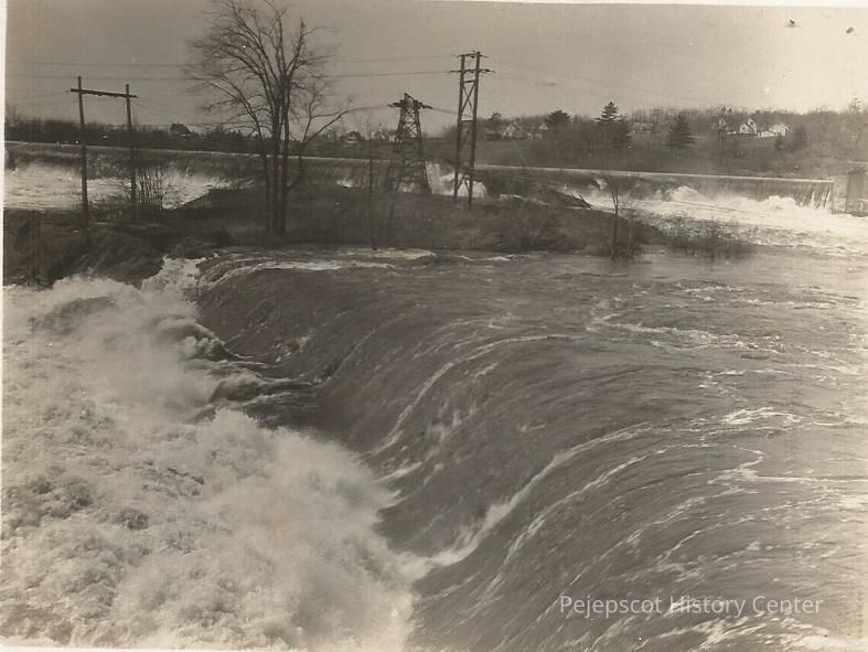 A B/W photograph of the Androscoggin River rushing over the falls taken from the Frank J, Wood Bridge, Topsham, ME. The river is very high.