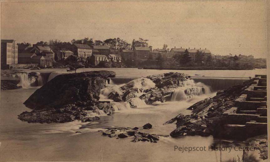 An undated black and white photograph shows the Topsham fishway on the Androscoggin River.
