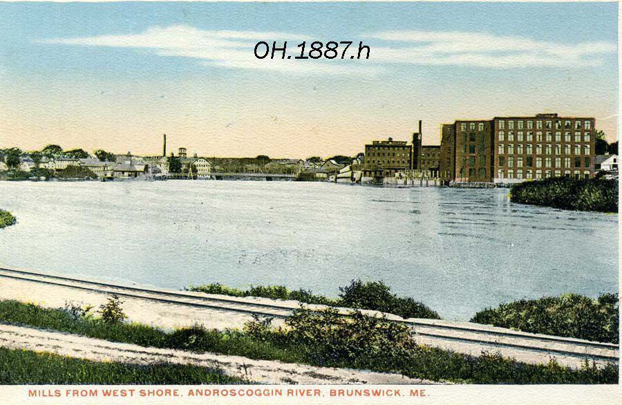 A color picture postcard of the Androscoggin River showing the Cabot Mill. Photo taken from the Brunswick, ME. side of the river. Not dated.