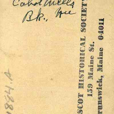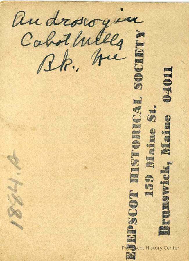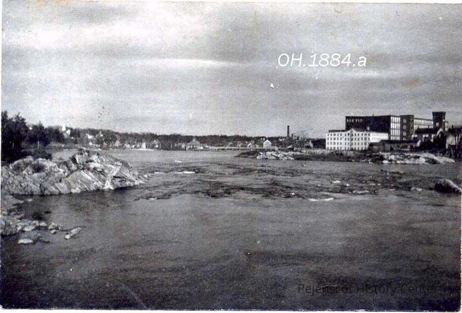 A B/W photograph of the Androscoggin River looking down river from the Brunswick, ME side. The Cabot Mill can be seen on the right Not dated.