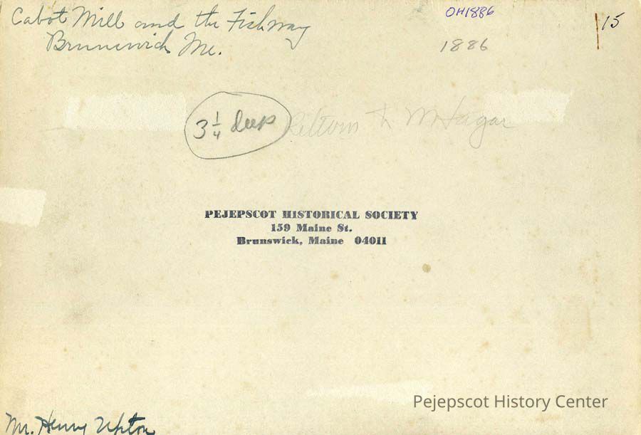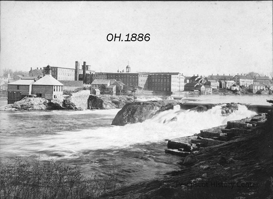 A B/W photograph of the Androscoggin River showing the falls with the Cabot Mill behind. The Topsham fishway can be seen in front. Brunswick, ME. Not dated.