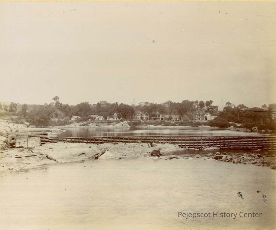 B/W photo of the dam on the Androscoggin River. Summer Street, Topsham, ME, is in the background. Dated 9/1/1894.