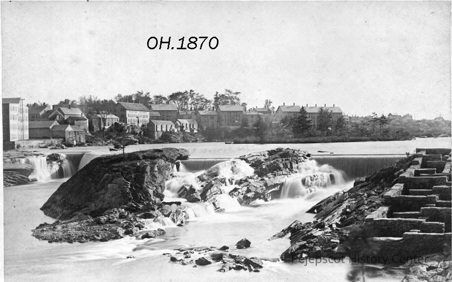 A B/W photograph of the dam on the Androscoggin River. The picture was taken from the Topsham side looking towards Brunswick, ME. The Topsham Fishway can be seen at the right. Not dated.
