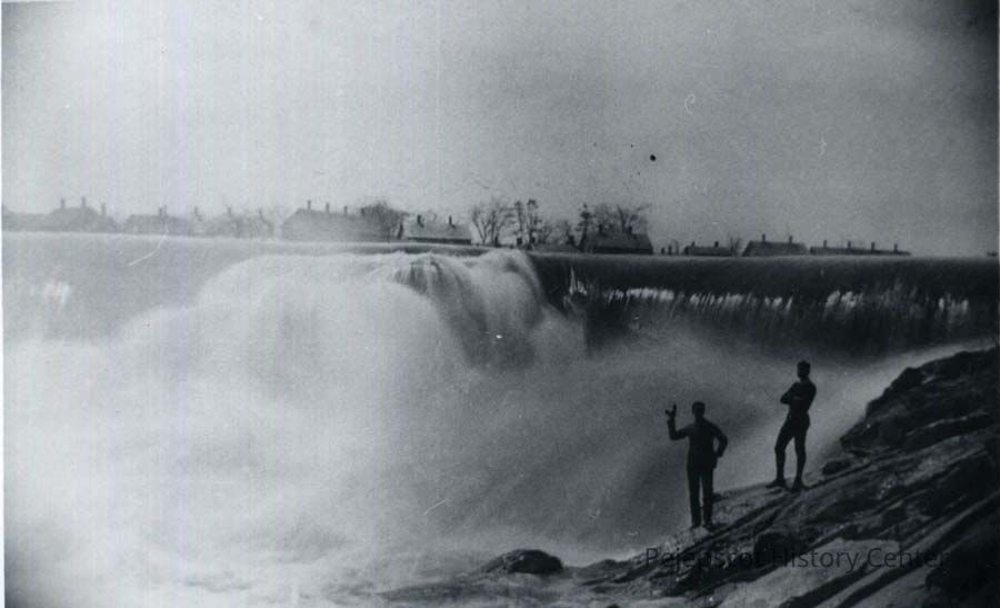 B/W photo of the falls on the Androscoggin River at flood stage. No date.