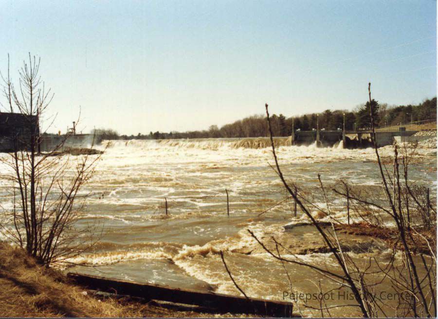 A color photo of the Androscoggin River Falls from the Topsham, Maine side during the April 1987 Flood.