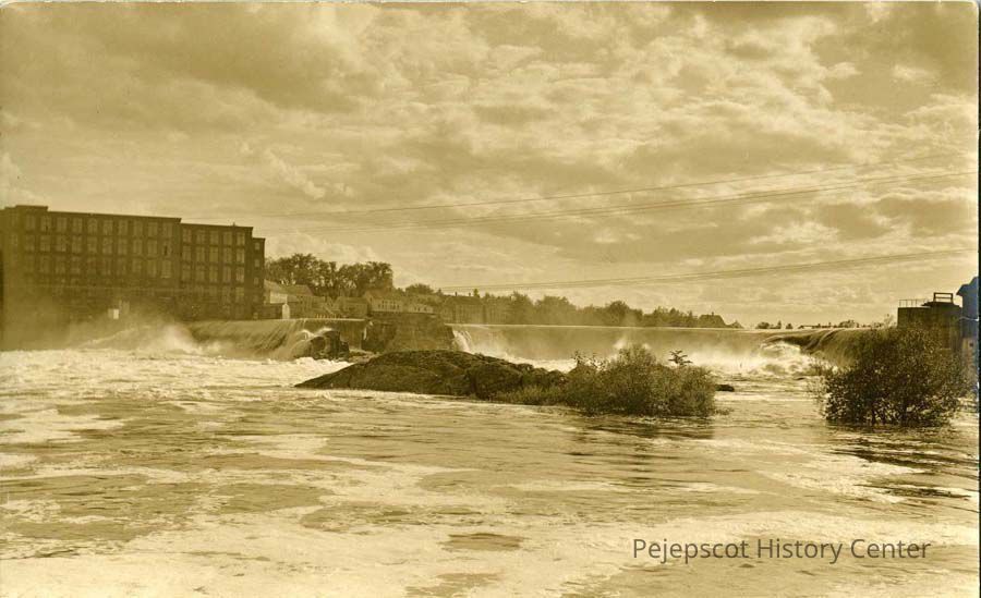 A sepia colored postcard of the Androscoggin River falls, Brunswick and Topsham, Maine.
