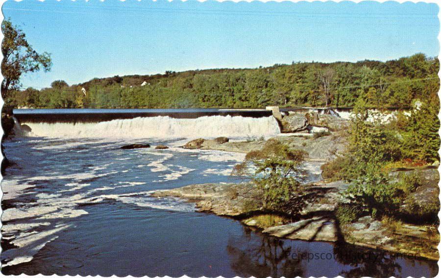 A color postcard shows the dam on the Androscoggin River between Brunswick and Topsham, Maine.Collection