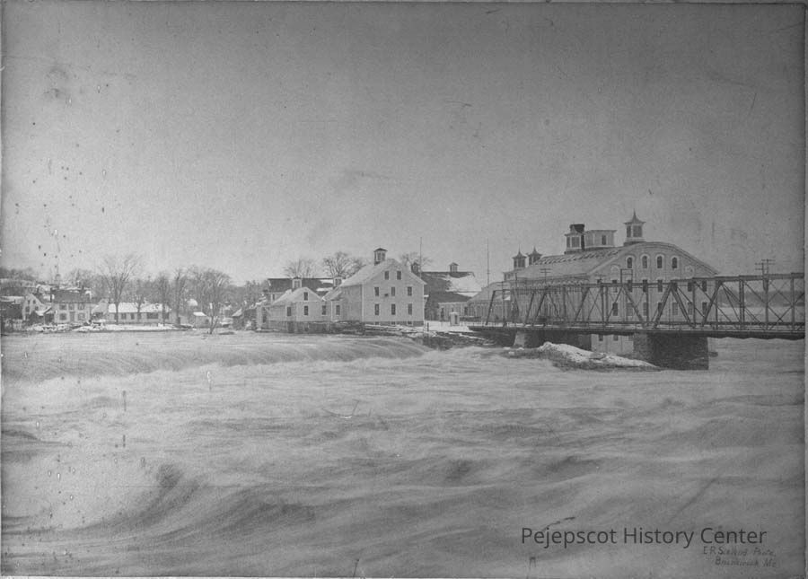 Great freshet on the Androscoggin River. View of FJ Wood bridge with the Pejepscot mill behind to the left. Other Main Street Buildings in Topsham further left. Photo not dated. Starbird photo. Mounted 70.5cm x 54cm; photo 56.5cm x 40.8cm