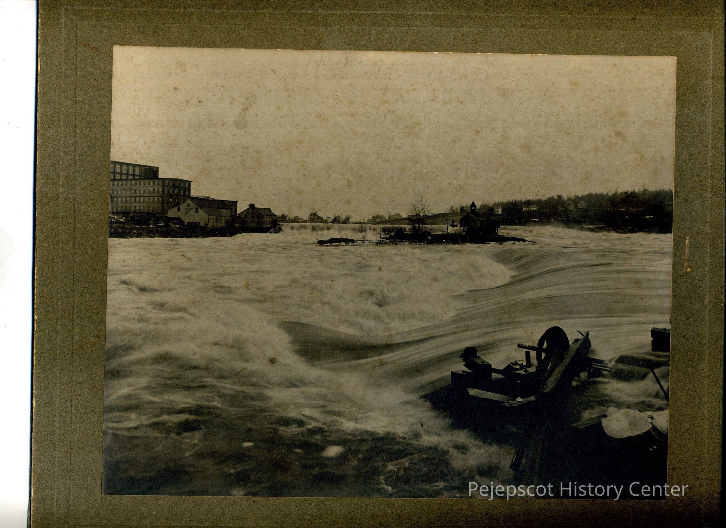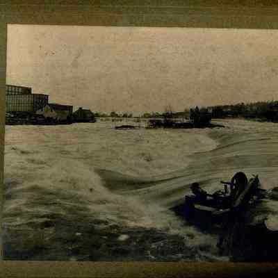 Black and white photograph showing the Androscoggin River in flood. Taken from Topsham, looking towards the Cabot Mill / Fort Andross. Photo on card. Undated