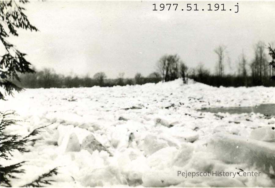 A B/W photograph of the Androscoggin River jammed with ice during 1936 flood. Printed on the front of the postcard it reads "Flood Scene, Brunswick, Maine, March 14-20, 1936".Lexicon