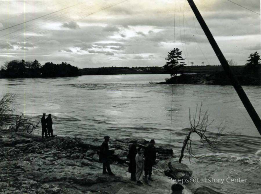A B/W photograph of people standing on the bank of the Androscoggin River watching the waters from the 1936 flood.
