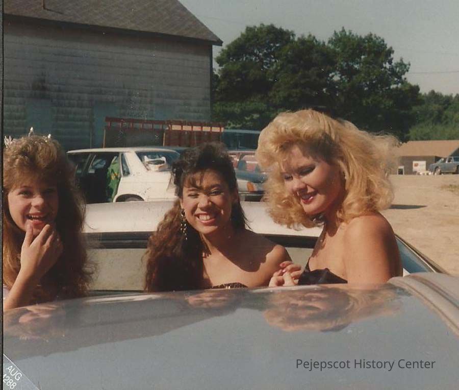 A color photograph of Angie Coady, Autumn Ison and Lisa Kelly getting out of the car at Bath Heritage Day Parade 7/4/1988.