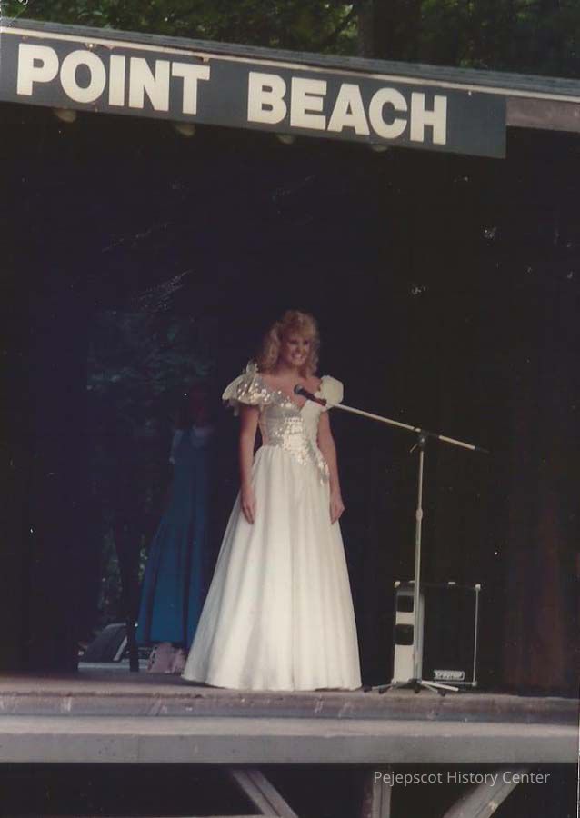 A color photograph of Angie Coady in the Gown Competition in the Miss Teen Maine pageant at Thomas Point Beach. 8/7/2988