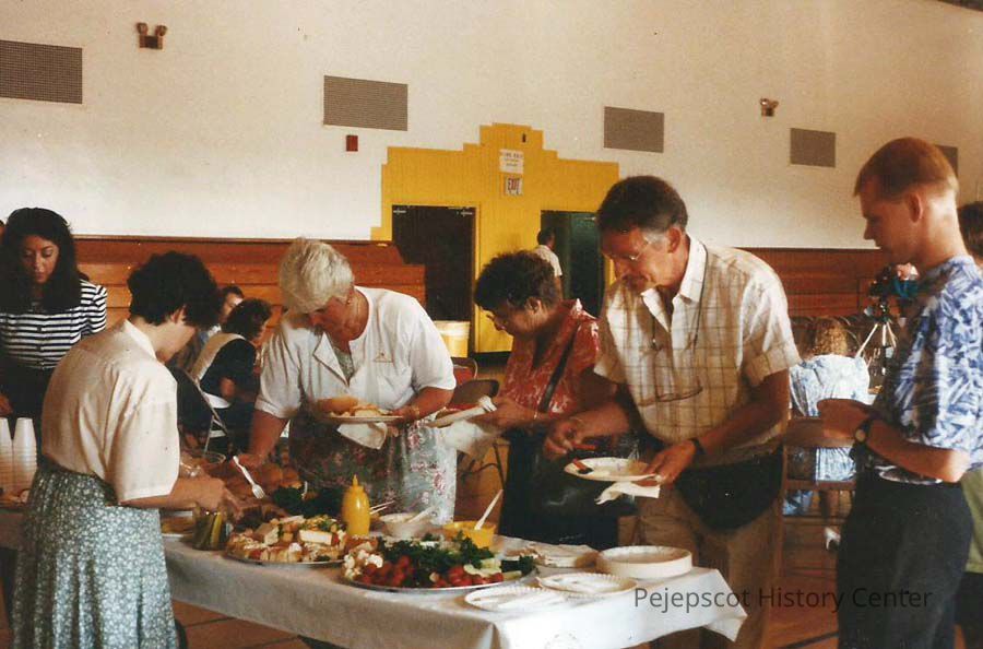 A color photograph of the buffet luncheon with Ann Rowe, June, Brad, & Dancer getting food while Sue is making adjustments to the table.