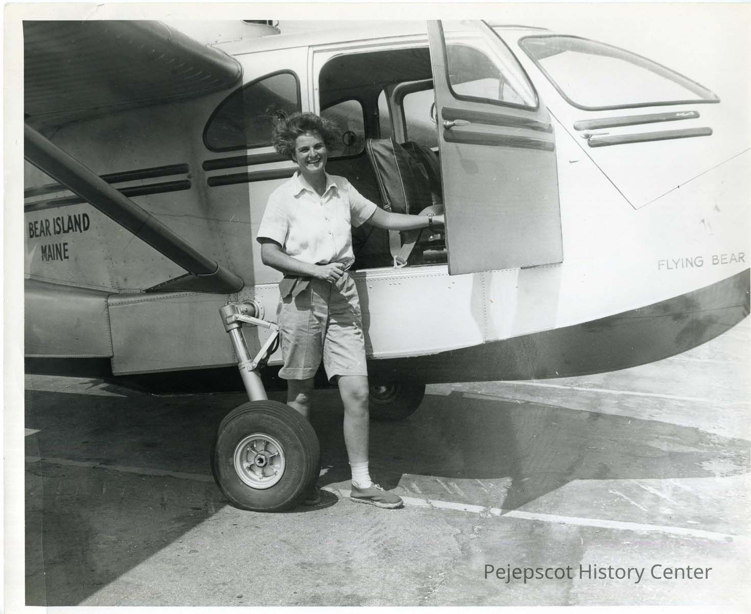 Ann Wood standing by the open door of a small plane named "Flying Bear". "Bear Island Maine" appears on the side of the plane under the wing. Undated