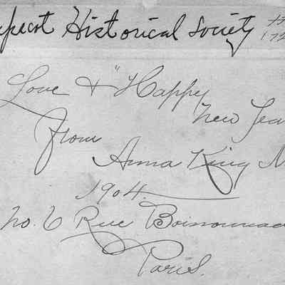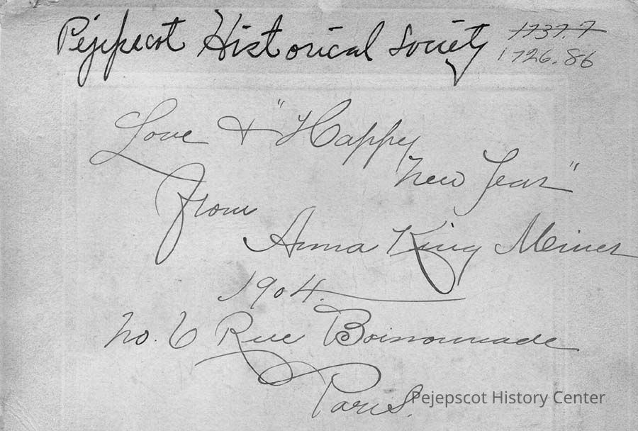 A B/W photograph of Anna King Meiner. The photo was mailed to the Pejepscot Historical Society from Paris in 1904. Photo not dated.