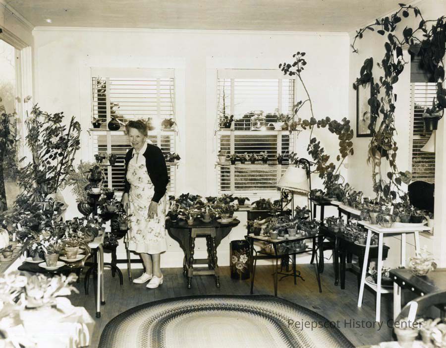 A B/W photograph of Annabelle Freeze of Hope Farm, Mere Point, in a room full of African violets. Undated
