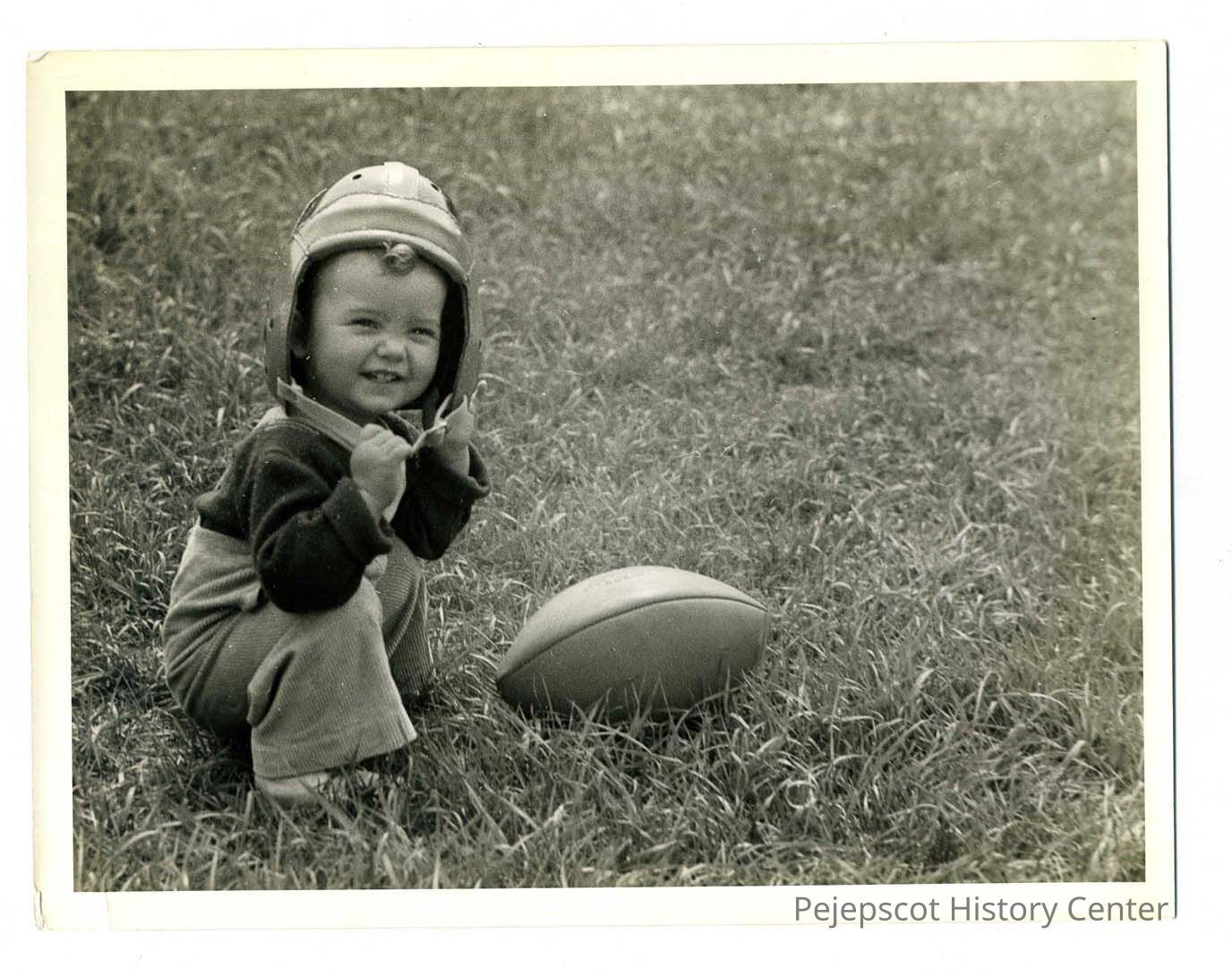 A very young Anne Crimmins squatting beside a football and wearing a football helmet. Undated