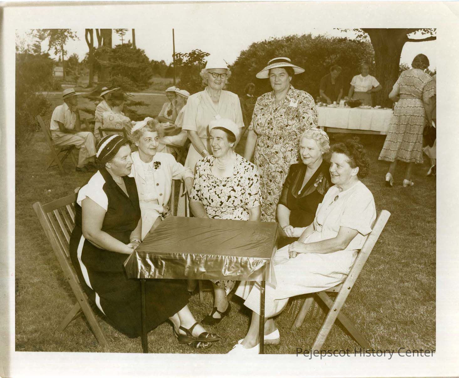 Five ladies sit around a card table and two stand behind them. The photo is taken outdoors with a refreshment table in the background. The lady sitting in the center is Anne Frances Hodgkins with members of the Harpswell Garden Club. The back of the picture refers to her as Mary Frances Hodgkins, but this name does not appear in any other records. Undated