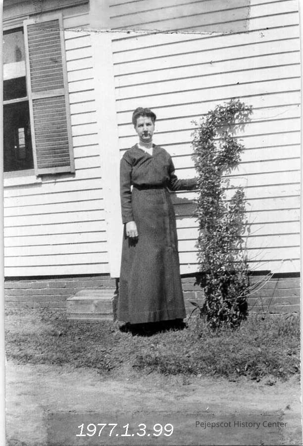 A B/W photograph of Annie Sylvester Carleton standing in front of a building. Undated