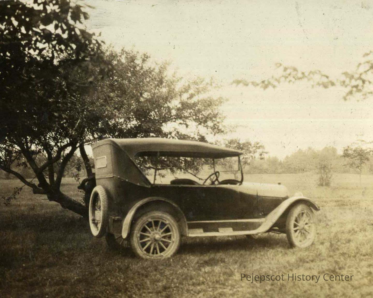 A B/W photograph of an antique car in a field staged in front of a tree. Undated.