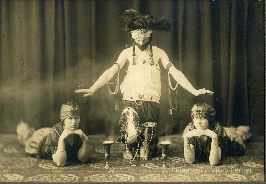 A trio of unidentified costumed people--appears as 2 girls and 1 boy (in center)--possibly photographed for a play. They appear to be in "gypsy," "harem," "Arab" or Middle Eastern-style dress.