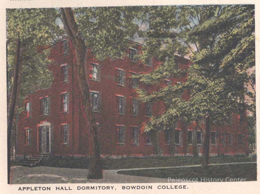 Postcard view of Appleton Hall Dormitory, Bowdoin College, Brunswick, Maine. Date unknown.
