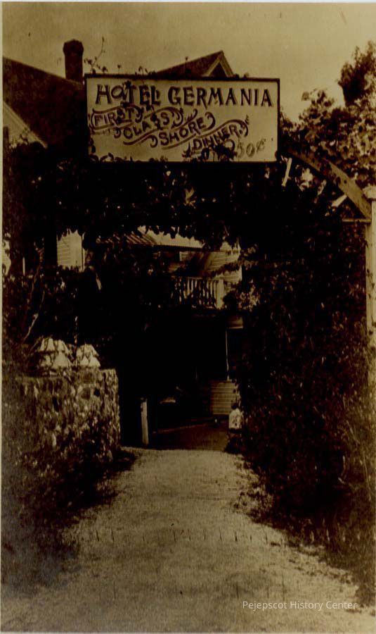 A copy print of the archway to the Germania Hotel. Was built around 1873 for James Merrow. The sign advertises complete shore dinners for fifty cents. See accession paper work for more info.Collection