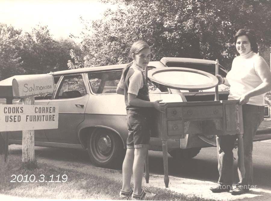 A B/W photograph of Arlene and Karin Salmonson. Arlene Salmonson is the owner of Cook's Corner Used Furniture on Thomas Point Road. Photo published 6/28/1976. Undated