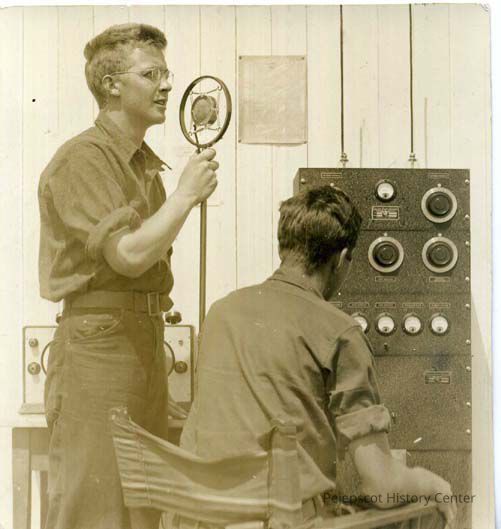Two men from the Army Air Corps are pictured here. One stands in front of a microphone and the other sits in front of a radio set. The back is stamped "5508 W.A.O. GROSS" and "WAO Gross and G.R. Codman" is written in pencil at the bottom of the photo. Undated