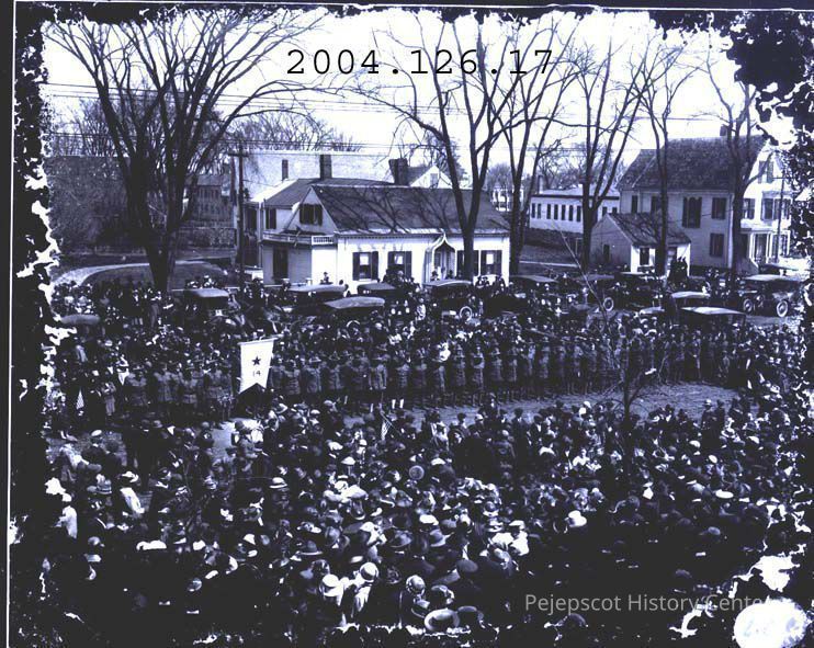 A B/W photograph of a group of Army men in formation on Maine Street.