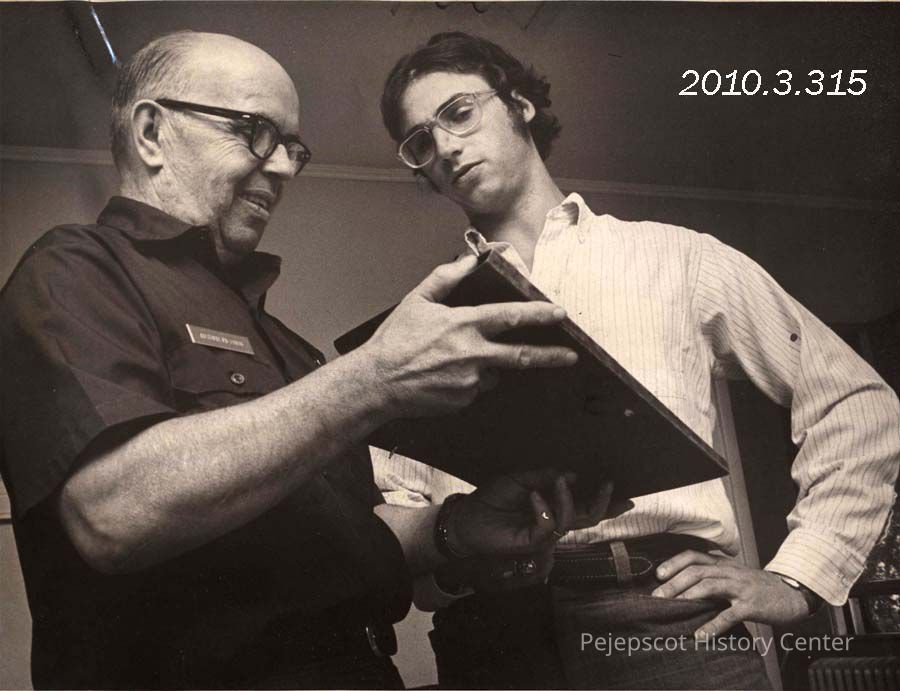 A B/W photograph of Brunswick Fire Department dispatcher Arthur Kiernan accepting a history of Billy Edwards, who served the town both as police and fire chief. The history was written by Asa Singer who presented his college thesis to Kiernan and that work is in the collection at Pejepscot History Center. Photo was published 8/26/1971. Undated