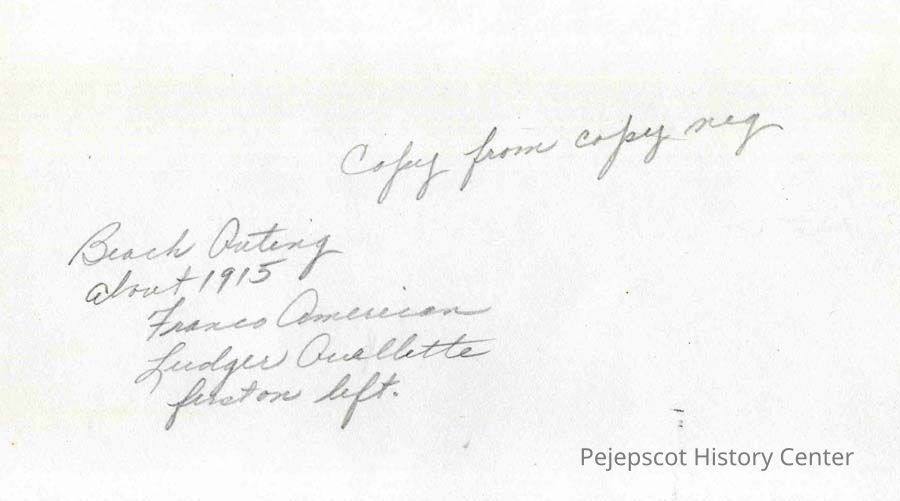 A B/W photograph of a group at the beach. They are all Franco Americans. Ludger Ouellette is on the left and his wife Flora Bouchard is on his left. circa 1915.