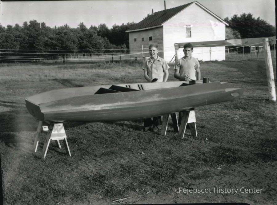 A B/W photograph of Atwood & Wilson building a gunning boat. 09/1948.