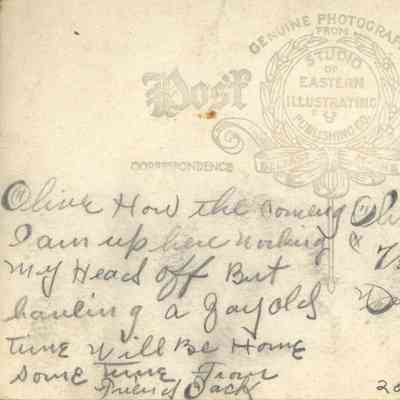 Oliver How the coming I am up here working my Head off But having a gay old time Will Be Home some Time From Tues Jack