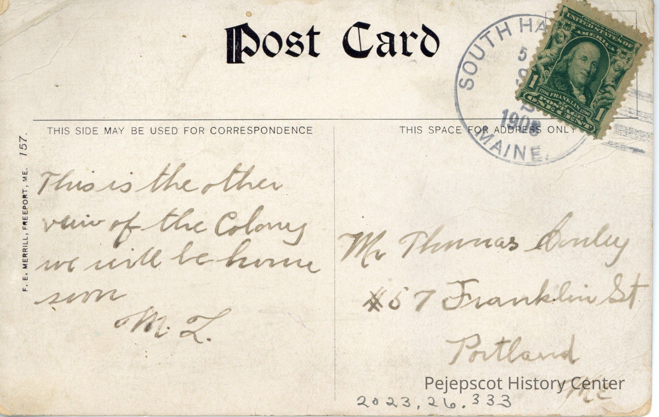 F. E. Merrill, Freeport, Me.Postmark