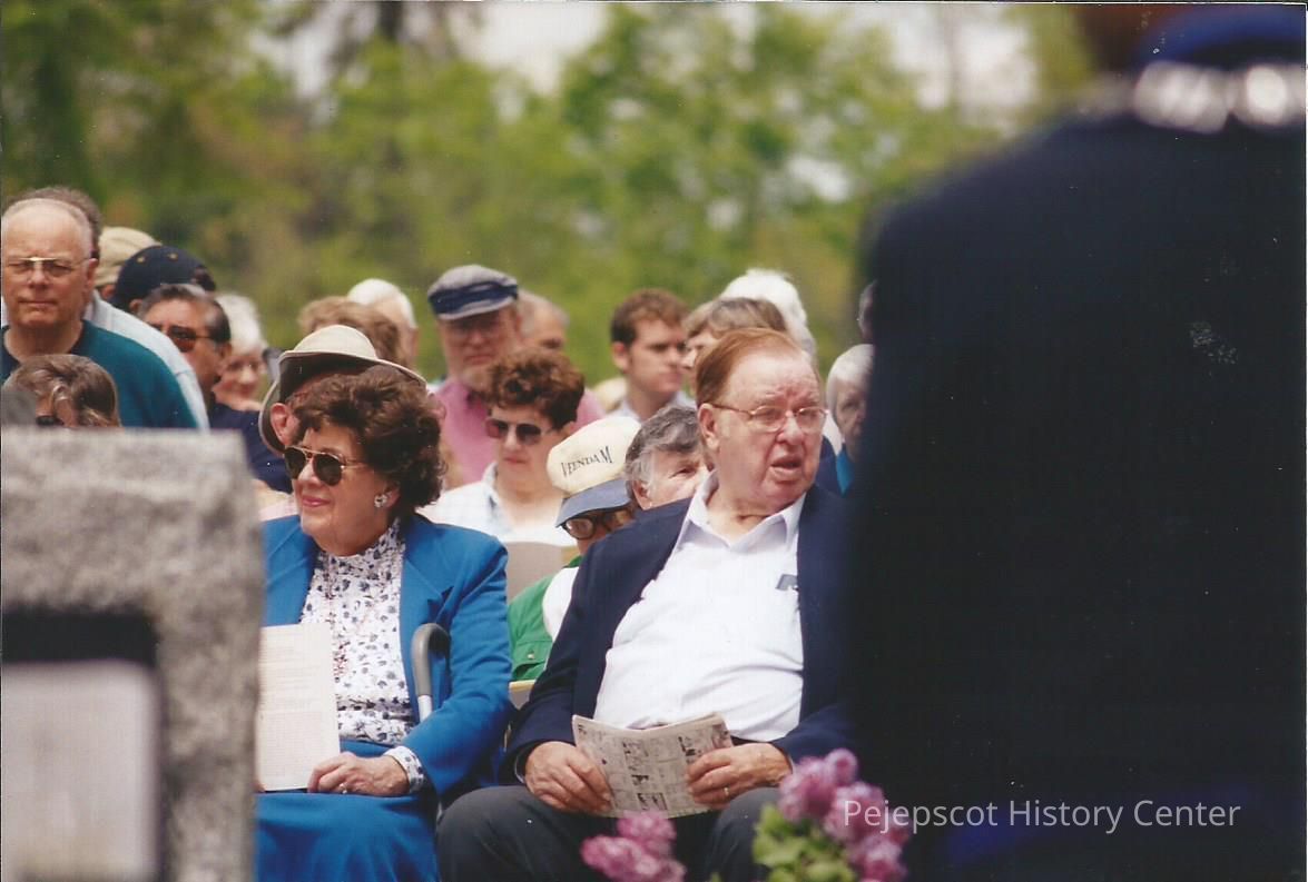 A color photograph of the audience at the Chamberlain Statue dedication ceremony in Brunswick, ME. An unknown man and woman sit in the front row in focus. Dated 05/31/2003.