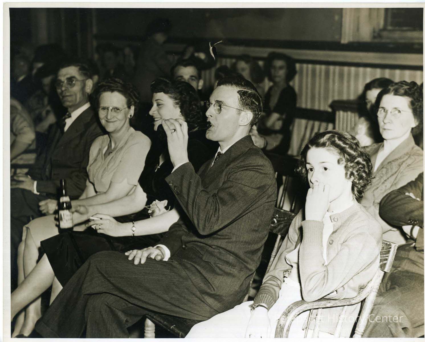 A picture of an audience sitting in the old Town Hall. Others included in the picture but not located are; Josephel Bouthot, Clarisse (Claire) Bouthot, Florence Bouthot, Louis Ouellette, and Vivien Favreau Breton. Undated