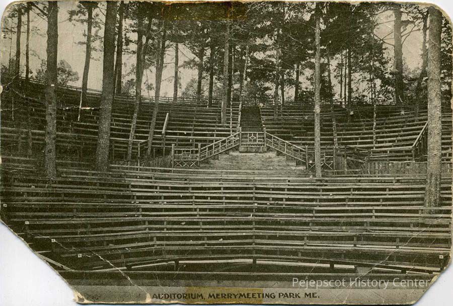 A black and white postcard of the Auditorium at Merrymeeting Park in Brunswick, ME.