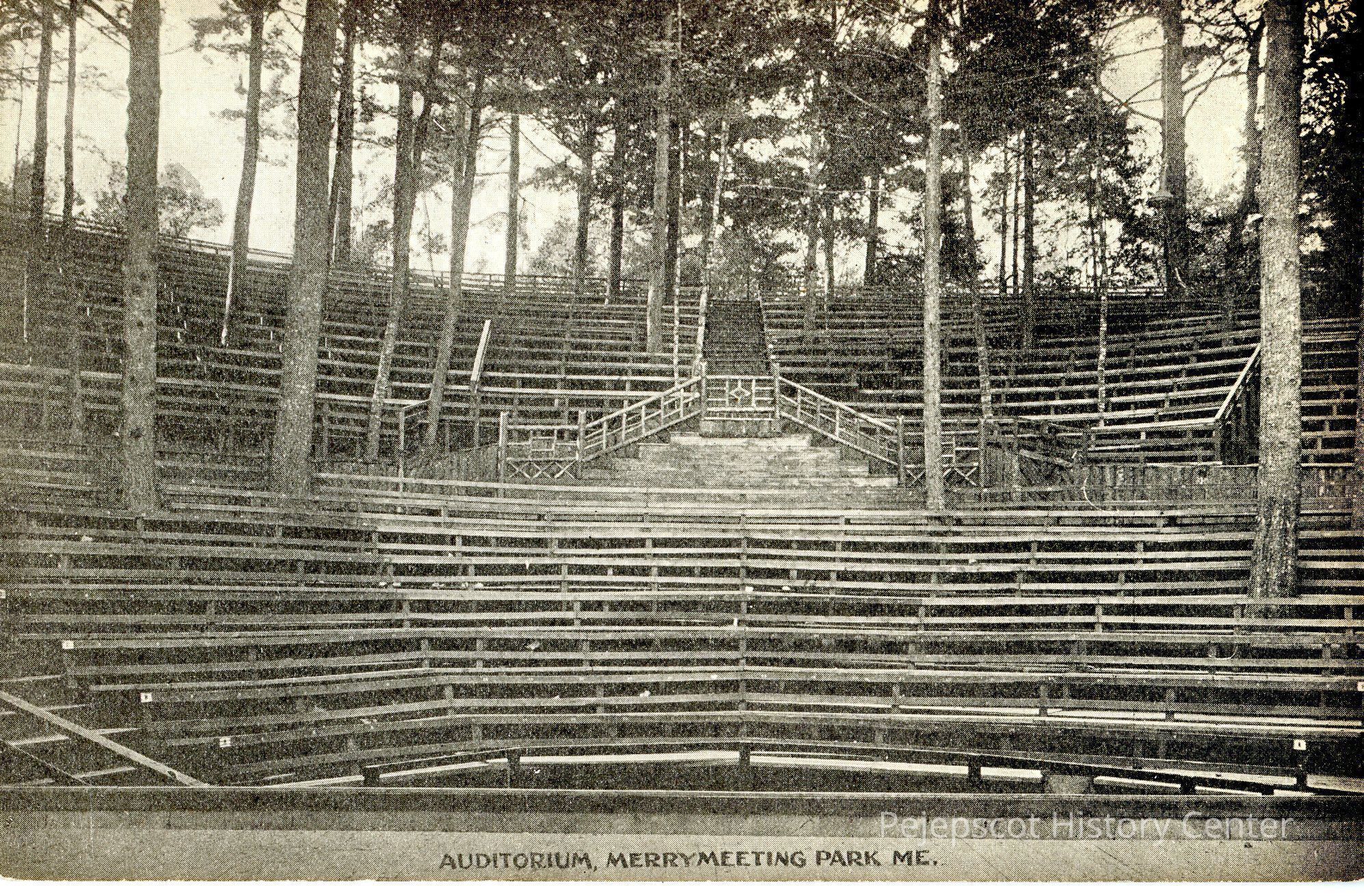 Black and white postcard of the auditorium in Merrymeeting Park, Brunswick, Maine. Published by Boston Post-Card Co. Undated.Postcard Details
