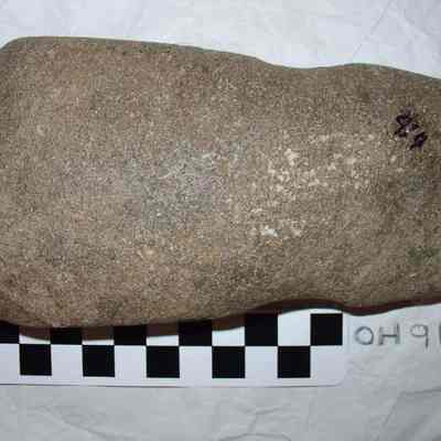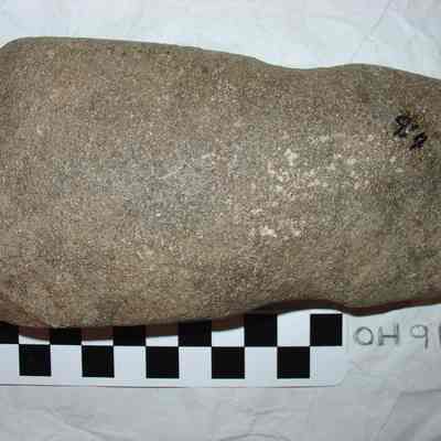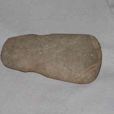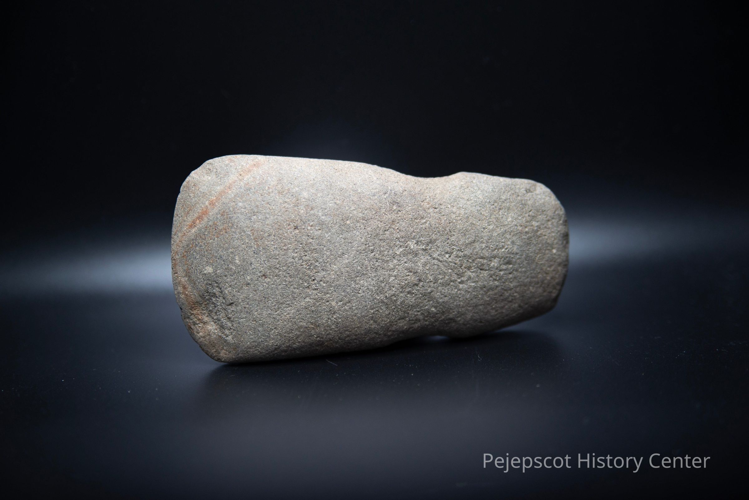 Stone ax head with a wider end narrowed to a wedge. There is a groove around the middle for attaching a handle.