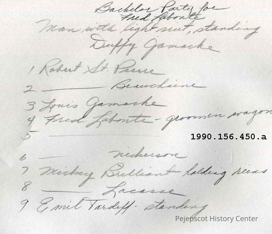1. Robert St. Pierre; 2. ? Beauchesne; 3. Louis Gamache; 4. Fred Labonte (Groomsman in wagon); 5. ?; 6. ? Nickerson; 7. Mickey Brilliant (holding the reins); 8. ? Lacasse; 9. Emil Tardiff (standing) UndatedCollection