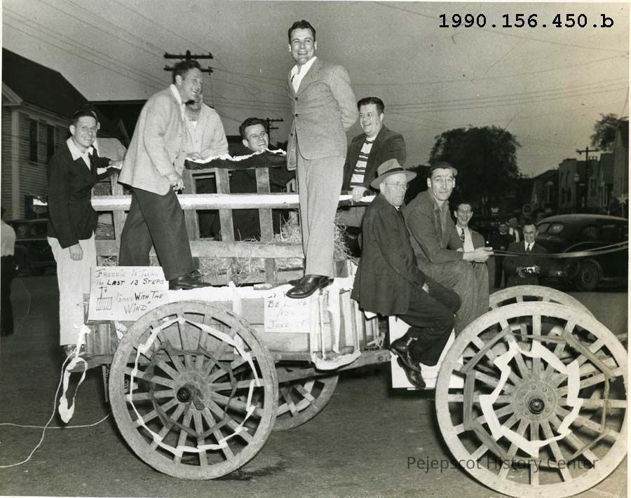 A B/W photograph of a bachelor party for Fred Labonte. The sign says, "Freddy is taking the last 13 steps to 'Gone With the Wind' and has a picture of a gallows on it. The men are: 1. Leo Desjardin; 2. ? Beauchesne; 3. Louis "Tilou" Gamache (in the light suit). In photo 1990.156.450.a he was identified as Duffy Gamache; 4. Fred Labonte (Groom); 5. ?; 6. ? Nickerson); 7. Mickey Brilliant; 8. Alphonse Lacasse; 9. Emil Tardiff (standing) Undated