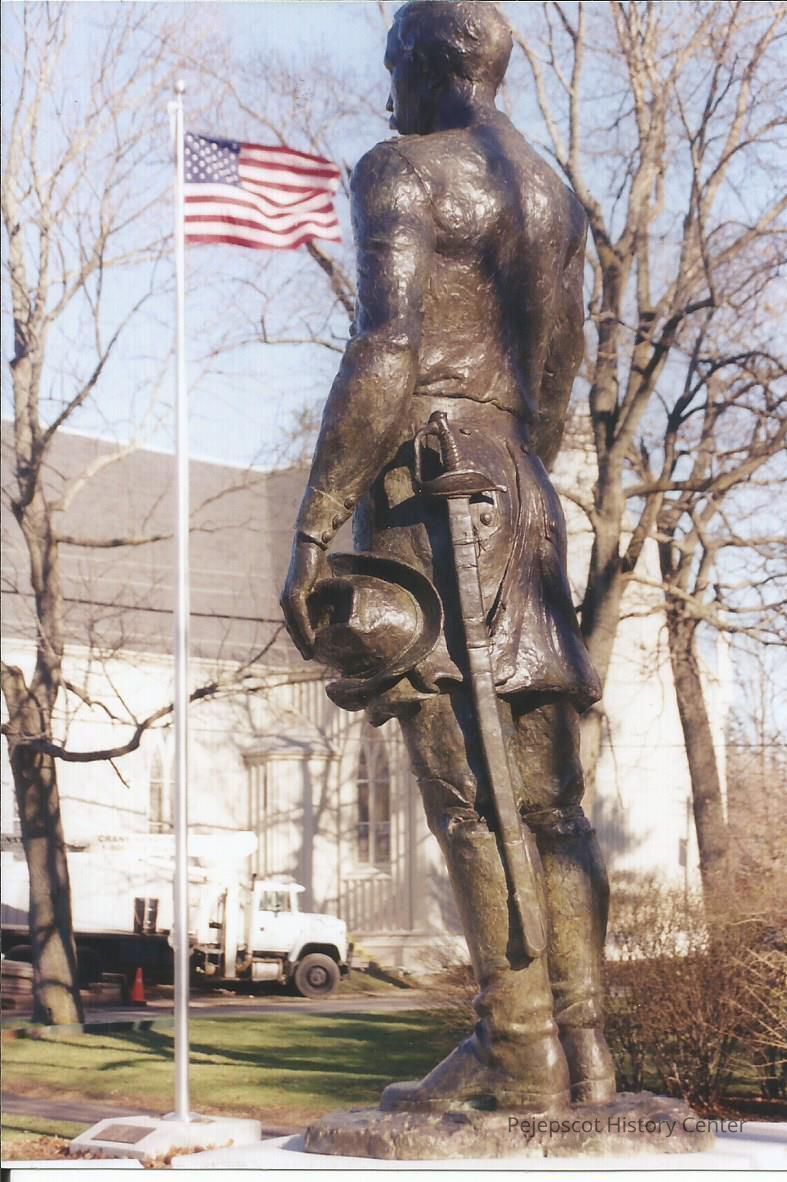A color photograph of the back side of the Chamberlain statue in Brunswick, ME. An American flag and the side of the First Parish Church can be seen beyond Chamberlain. Undated.